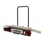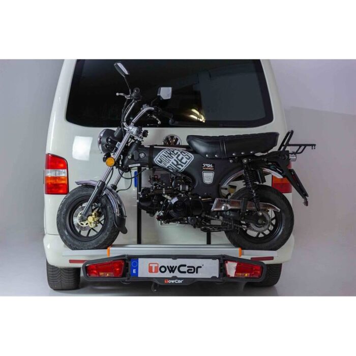 Porte moto Racing. Idéal pour transporter des mini-motos, cyclomoteurs, motos de trial, ou tout type de 2 roues légers. Se monte sur la boule d’attelage, charge max 75Kg, compatible prises 7 ou 13 pins, anti-vol sur la tête d’attelage. Livré avec rampe d’accès, mais sans l’adaptateur roue oblique. Vérifier la compatibilité de l’attelage monté sur votre voiture, c’est lui qui dictera le poids maximum acceptable.
