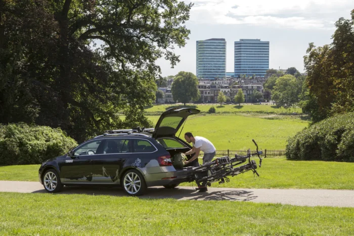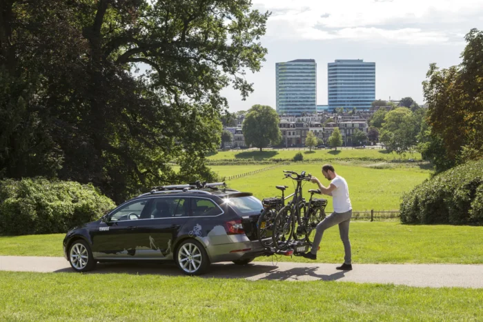 Même avec les vélos montés, vous avez un accès aisé au coffre grâce à la pédale de basculement pratique. Il suffit d’appuyer sur la pédale pour faire basculer le porte-vélo de manière qu’il y ait plus d’espace pour charger et décharger vos affaires. En montant le porte-vélo sur la boule d’attelage, le porte-vélo peut facilement être ajusté grâce à la stabilisation initiale de la fixation sur boule d’attelage. Après l’ajustement, le porte-vélo est verrouillé avec la poignée de serrage. Après avoir utilisé le porte-vélo, il est facilement pliable et transportable grâce aux poignées de transport intégrées.
