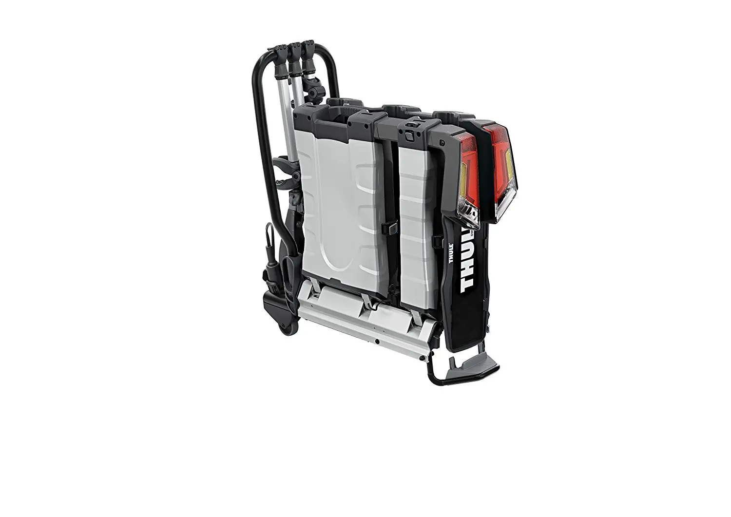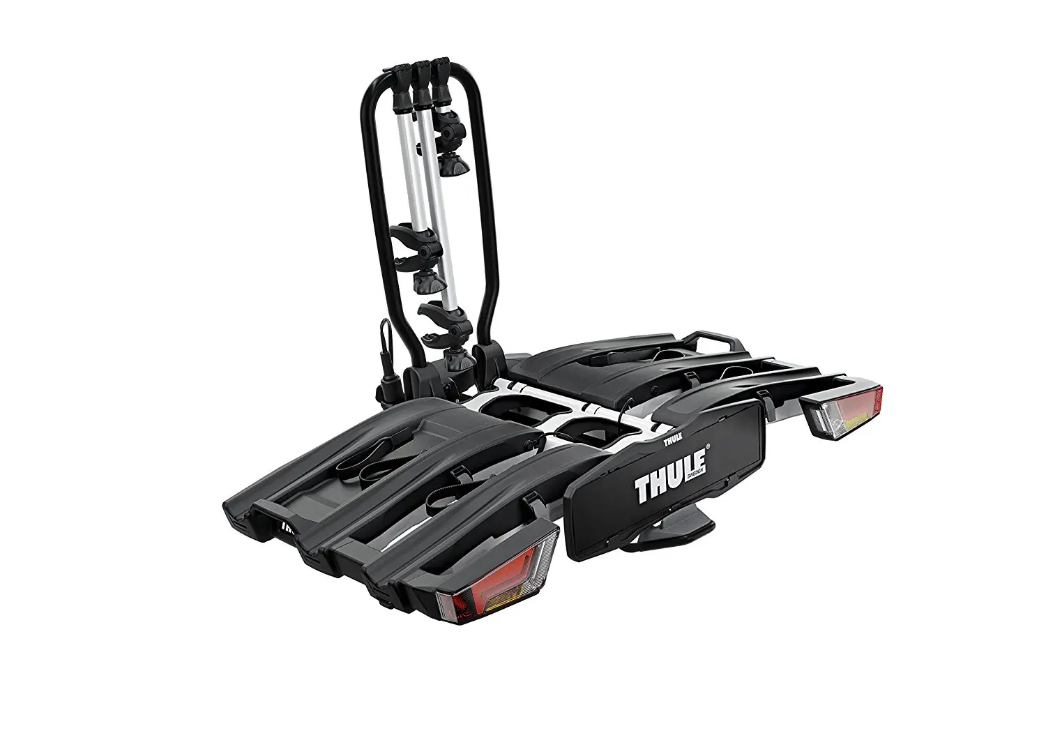 Le Thule EasyFold XT est un porte-vélo complètement pliable de Thule qui est facile à utiliser, à ranger et à monter. Le porte-vélo Thule EasyFold XT 3 est doté d’une grande capacité de charge de sorte que celui-ci est idéal pour le transport des vélos électriques et des VTT lourds. La rampe de chargement qui est vendue séparément permet qu’il est très facile de transporter des vélos lourds. Les vélos sont faciles à fixer à l’aide des bras de fixation verrouillables Thule AcuTight qui sont fixés au cadre. Ces bras de fixation sont équipés d’un limiteur de couple de serrage qui indique quand le serrage optimal est atteint. Ensuite, les boucles micro-clip réglables permettent une fixation rapide des roues. Celles-ci sont plus longues que d’habitude ce qui vous permet de fixer des roues avec une dimension de 4,7″ au maximum. Enfin, il est possible de verrouiller les vélos au porte-vélo et de verrouiller le porte-vélo à la boule d’attelage.