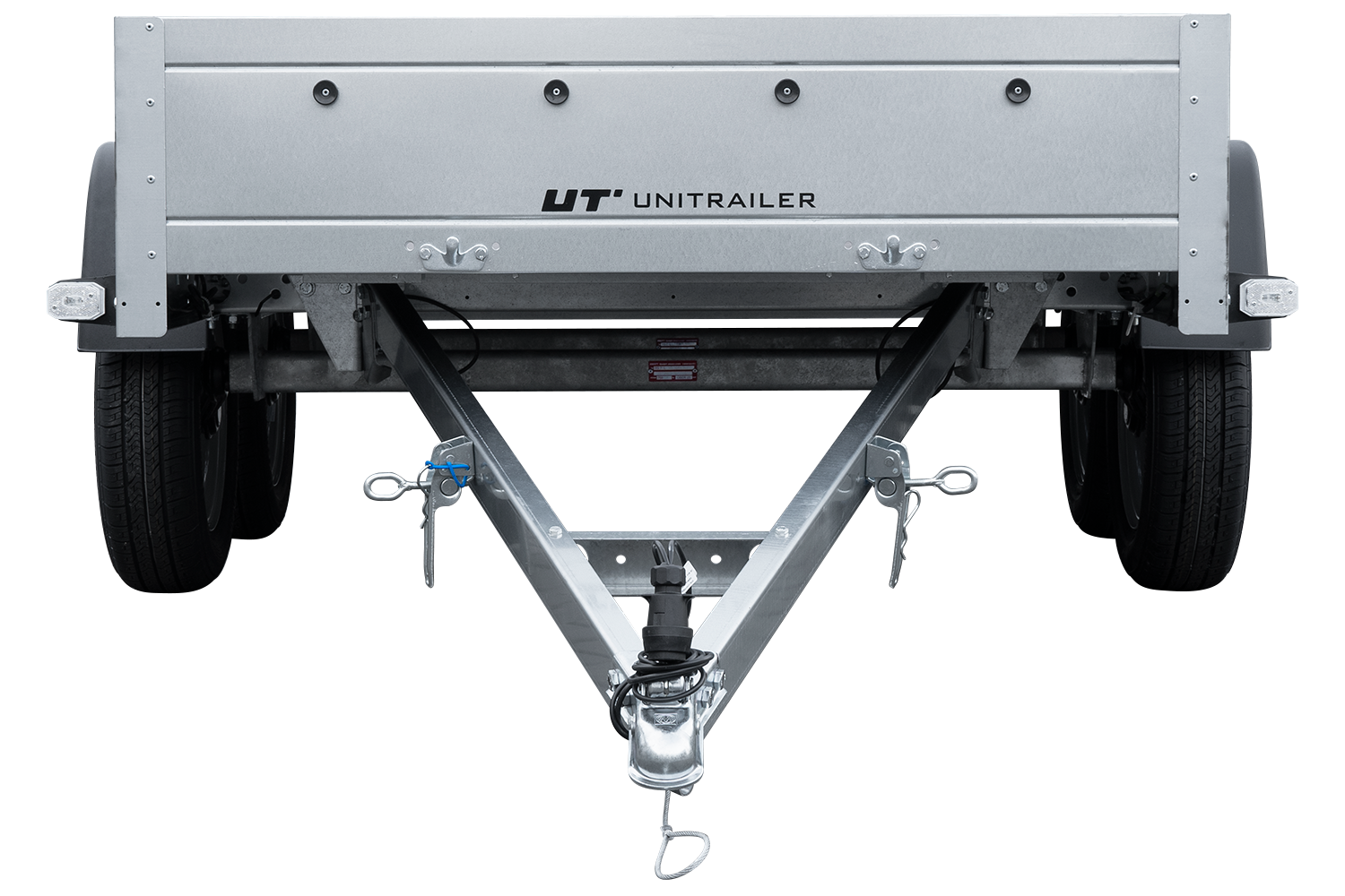 • Timon en V inclinable, qui peut être replié à tout moment sous la plaque de plancher de la remorque.