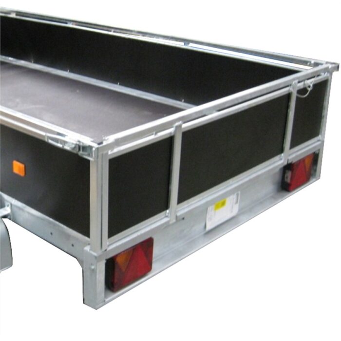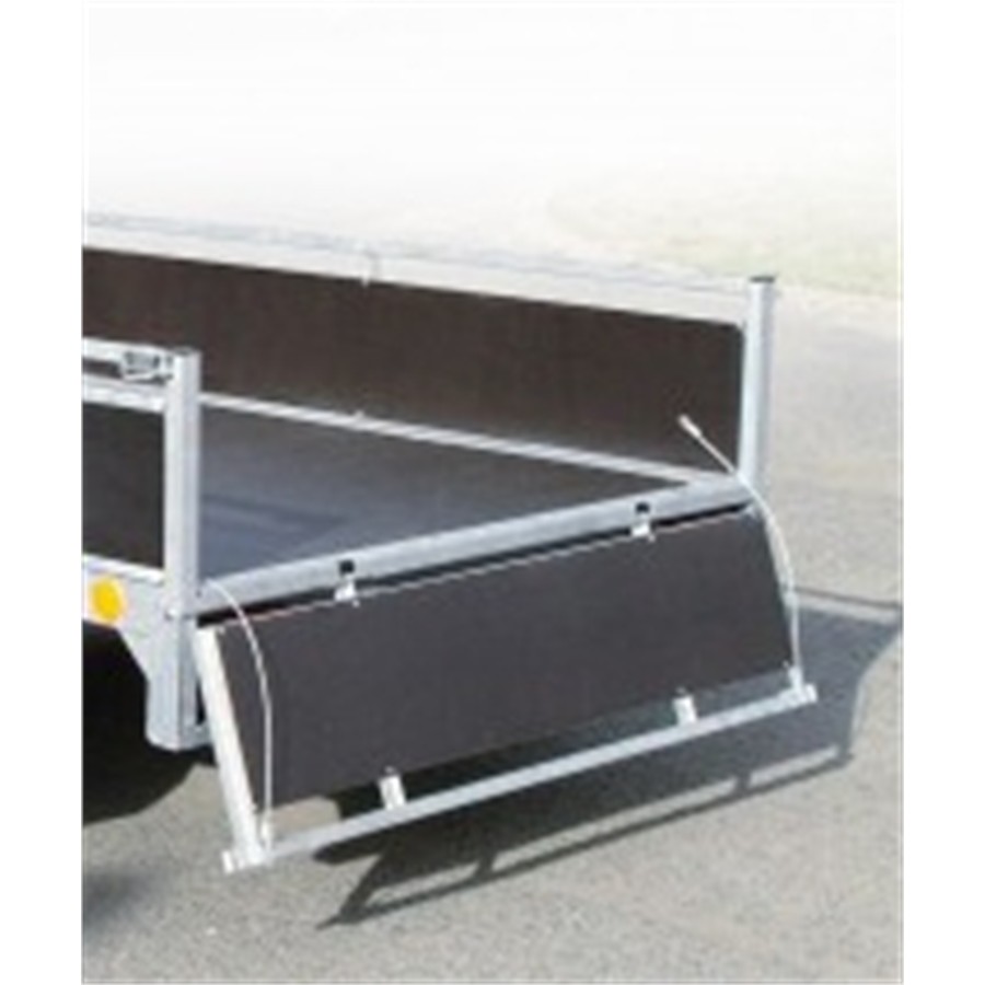 Sur cette remorque, seule la ridelle arrière est à la fois amovible et rabattable.