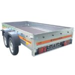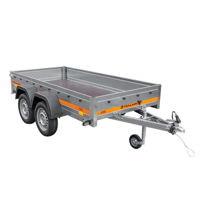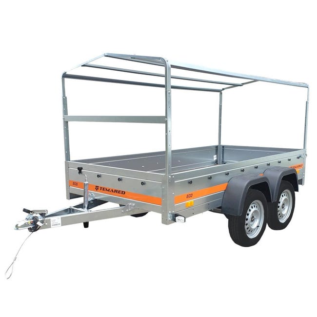 Grande remorque bâchée double essieu TEMA ECO2612/2 Dimensions utiles de la caisse : 263 X 125 X 110 cm. Une bâche haute fournie pour un volume de stockage important, sécurisé et protégé. Extrêmement pratique pour les déménagements, travaux dans la maison, jardinage… 2 X essieux, AL-KO force 750 kg (1500 kg). PTAC : 500 kg – pas de carte de grise, ni de permis ni d’assurance supplémentaire nécessaire. La remorque est équipée d’une ridelle arrière ouvrante, rabattable et amovible. Très pratique, la plaque d’immatriculation s’installe sans rivets, à l’aide de clipse de maintien. CHÂSSIS : Un axe de type UBR 700 AL-KO ou KNOTT Taille de pneus standard : 155/70 R13 Timon type V 750 kg (fixe) Poids de la remorque 190 kg environ CORPS : Châssis de support: en profilé plié, épaisseur de tôle d’acier : 2,5 mm. Galvanisée, fixation-vis. Surface: contreplaqué anti-dérapant 9 mm d’épaisseur. Ridelles en acier galvanisé. Ridelle arrière ouvrante d’une hauteur de 30 cm. Roue jockey incluse. Armature de bâche et une bâche haute de 80 cm incluse. Hauteur totale de la bâche avec les ridelles 110 cm. Hauteur de la tête d’attelage : 35 cm.