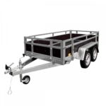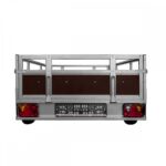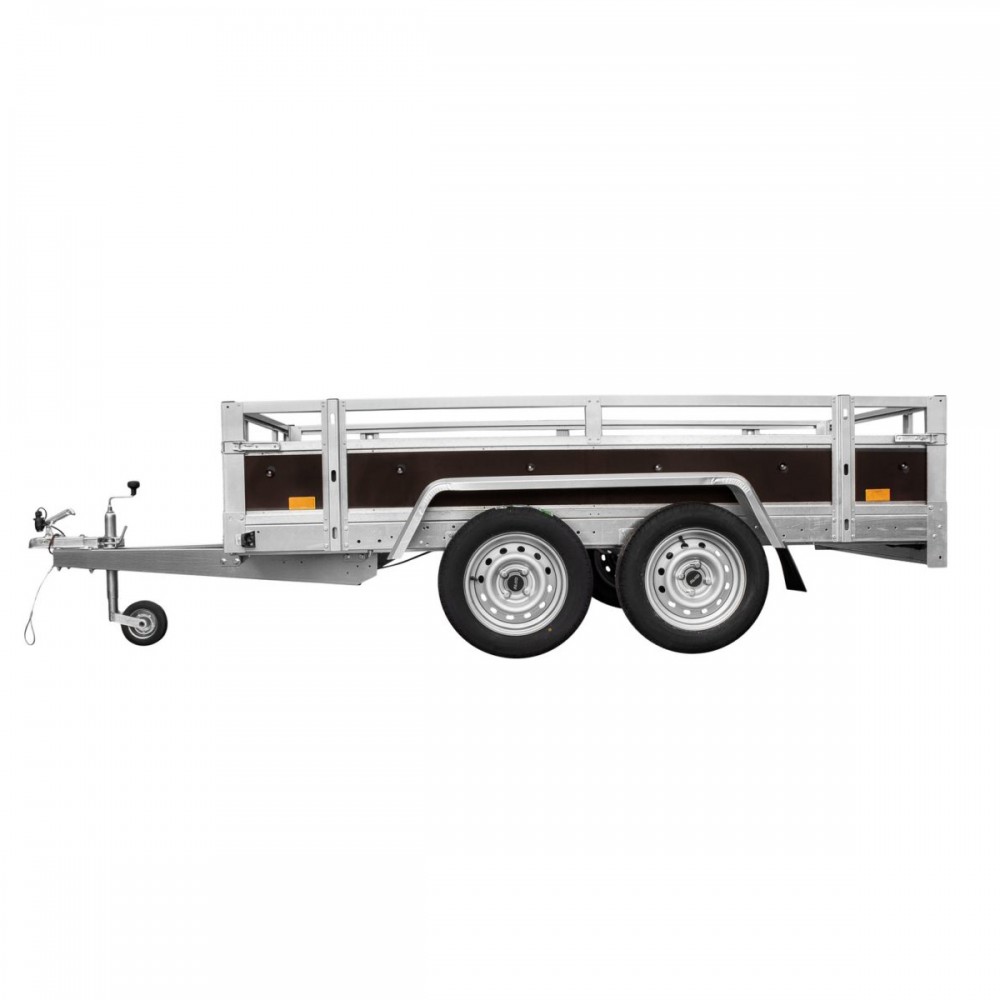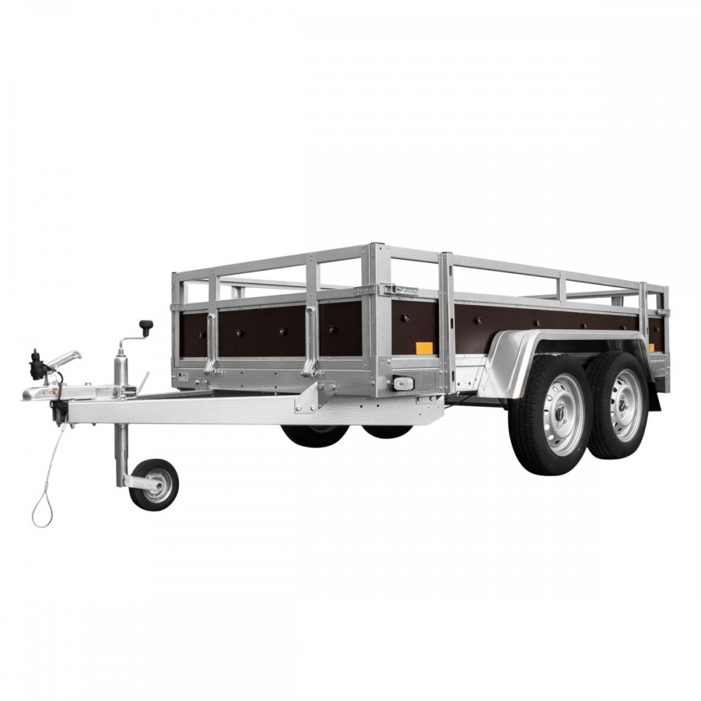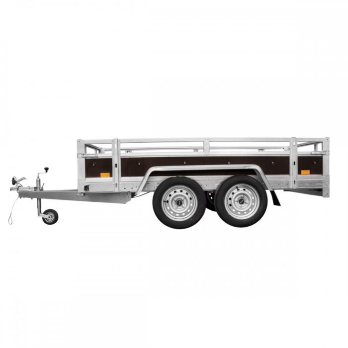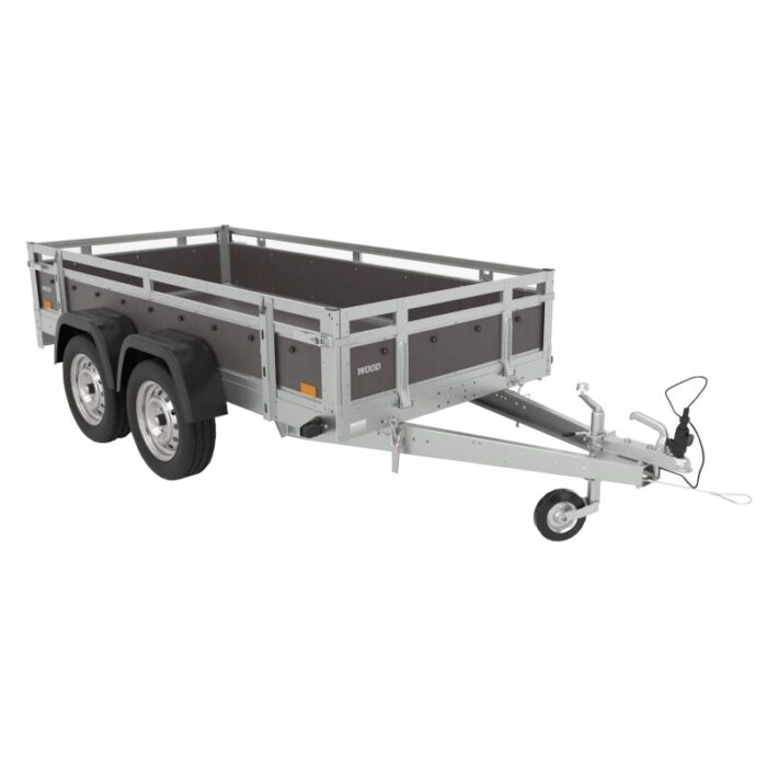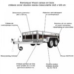 WOOD Remorque double essieux basculante caisse contreplaqué châssis acier 263×125 cm CARACTÉRISTIQUES : Remorque durable et robuste composée d’une caisse en contreplaqué marine avec plancher anti-dérapant de 9 mm. Le châssis porteur en tôle d’acier profilé de 2,5 mm est galvanisé fixation-vis. Double essieu, elle est équipée de suspension indépendante avec ressort sur 2 rouleaux tournant. Cette remorque basculante s’inclinera manuellement pour faciliter vos déchargements. Les ridelles situées à l’avant et à l’arrière de la remorque sont ouvrantes, rabattables, amovibles et elles disposent d’une fermeture sécurisée. Remorque solide et résistante aux chocs et aux intempéries. Pas de carte de grise, ni de permis ni d’assurance supplémentaire nécessaires (jusqu’à PTAC 499 kg). PTAC 750 kg sur demande (selon votre choix, nous contacter). Très pratique, la plaque d’immatriculation s’installe sans rivets à l’aide de clipses de maintien. CARACTÉRISTIQUES TECHNIQUES : Caisse en contreplaqué marine Plancher en contreplaqué anti-dérapant de 9 mm Double châssis AL-KO N 750 kg en acier galvanisé (1500 kg) Double essieu Inclinable manuellement Pneus 155/70 R3 Ridelles avant et arrière ouvrantes, rabattables et amovibles Timon type V fixe ou pivotant Roue jockey incluse Capacité de chargement : 400 – 750 kg DIMENSIONS ET POIDS : Dimensions plancher : Longueur 263 x Largeur 125 cm Hauteur ridelle : 40 cm Hauteur tête d’attelage : 35 cm Longueur timon : 104 cm Poids : 200 kg.À NOTER : Remorque neuve livrée montée (sur plateau ou tractée derrière un véhicule) SOUS 4 SEMAINES MAXIMUM en France continentale uniquement (hors Corse et îles).